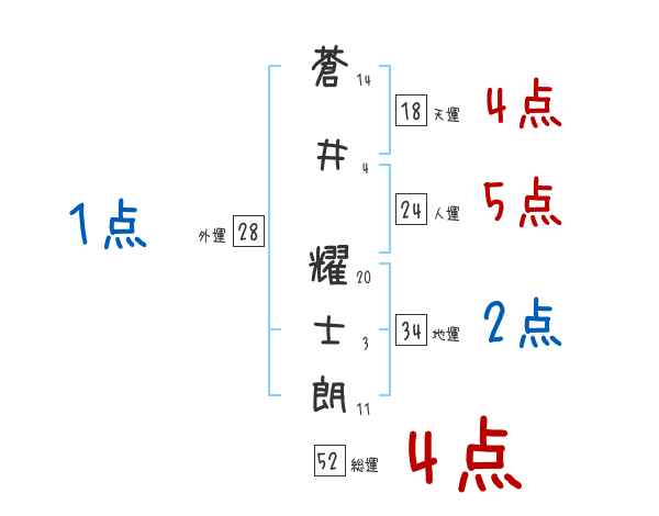 天運![]() | 蒼井耀士朗さんの天運は18画の4つ星!情熱的で剛気。忍耐力があり信頼される。 家系が持つ宿命的な運勢を表します。祖先から受け継いだ苗字ですので自分の力が及びません。家柄を象徴します。 |
