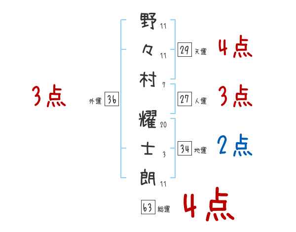 天運![]() | 野々村耀士朗さんの天運は29画の4つ星!完全主義で才能がある。厳格な心の持ち主。 家系が持つ宿命的な運勢を表します。祖先から受け継いだ苗字ですので自分の力が及びません。家柄を象徴します。 |