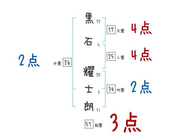天運![]() | 黒石耀士朗さんの天運は17画の4つ星!積極的な行動力。地位を気づき財産を手に入れる。純粋な心と直感力。 家系が持つ宿命的な運勢を表します。祖先から受け継いだ苗字ですので自分の力が及びません。家柄を象徴します。 |