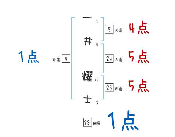 天運![]() | 一井耀士さんの天運は5画の4つ星!健康で安泰。協調性に優れ、財産に恵まれる。 家系が持つ宿命的な運勢を表します。祖先から受け継いだ苗字ですので自分の力が及びません。家柄を象徴します。 |