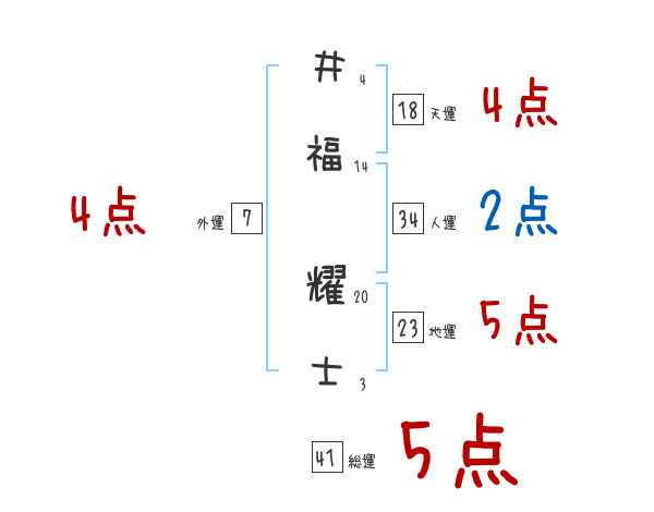 天運![]() | 井福耀士さんの天運は18画の4つ星!情熱的で剛気。忍耐力があり信頼される。 家系が持つ宿命的な運勢を表します。祖先から受け継いだ苗字ですので自分の力が及びません。家柄を象徴します。 |