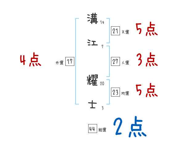 天運![]() | 溝江耀士さんの天運は21画の5つ星!統率力がある。独立し成功する。名誉を手に入れる。 家系が持つ宿命的な運勢を表します。祖先から受け継いだ苗字ですので自分の力が及びません。家柄を象徴します。 |