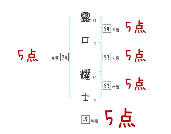 総運![]() | 露口耀士さんの総運は47画の5つ星!実力が開花し発展する円満な人生。財に恵まれる。 あなたの人生を表す1番重要な運勢です。生涯を通じて影響する総合運となり、主に50歳以降の晩年期に影響を及ぼします。 |