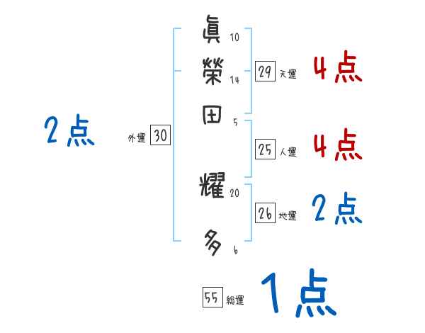 天運![]() | 眞榮田耀多さんの天運は29画の4つ星!完全主義で才能がある。厳格な心の持ち主。 家系が持つ宿命的な運勢を表します。祖先から受け継いだ苗字ですので自分の力が及びません。家柄を象徴します。 |