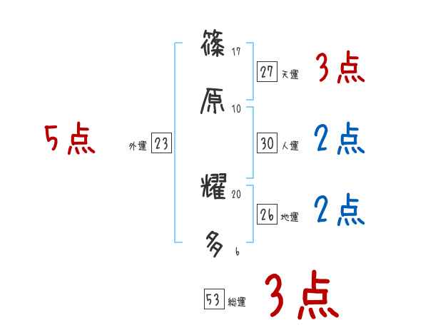 総運![]() | 篠原耀多さんの総運は53画の3つ星!やや見栄っ張りで虚栄心がある。散財に注意。 あなたの人生を表す1番重要な運勢です。生涯を通じて影響する総合運となり、主に50歳以降の晩年期に影響を及ぼします。 |