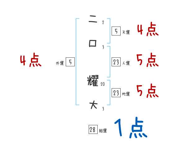 総運![]() | 二口耀大さんの総運は28画の1つ星!家庭環境に注意。スポーツで活躍できる能力があるかも。 あなたの人生を表す1番重要な運勢です。生涯を通じて影響する総合運となり、主に50歳以降の晩年期に影響を及ぼします。 |
