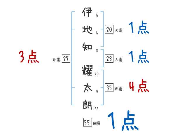 総運![]() | 伊地知耀太朗さんの総運は55画の1つ星!欲張りな性格で軽率な行動に注意しましょう。病気に気をつけて。 あなたの人生を表す1番重要な運勢です。生涯を通じて影響する総合運となり、主に50歳以降の晩年期に影響を及ぼします。 |