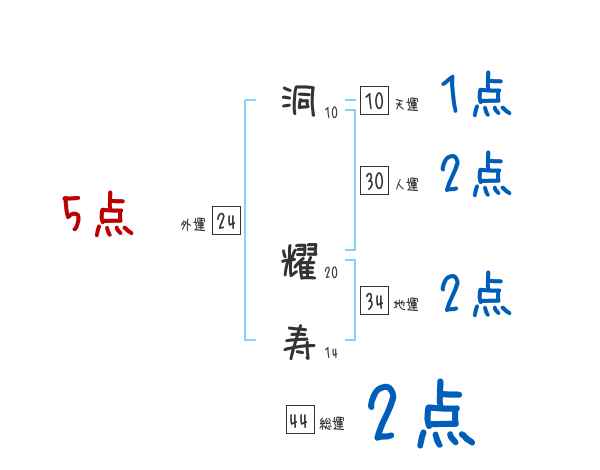 外運![]() | 洞耀寿さんの外運は24画の5つ星!家庭運が良く順調な人生。金運にも恵まれる。 生活面を象徴する運勢です。外部から受ける影響力を表し、結婚運、家庭運や職場、環境への順応性を表します。 |