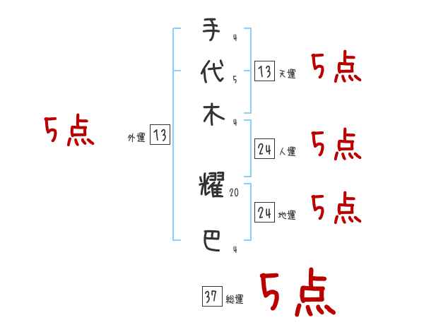 天運![]() | 手代木耀巴さんの天運は13画の5つ星!才能に恵まれ人気がある。名声を手に入れる。円満な人生。 家系が持つ宿命的な運勢を表します。祖先から受け継いだ苗字ですので自分の力が及びません。家柄を象徴します。 |