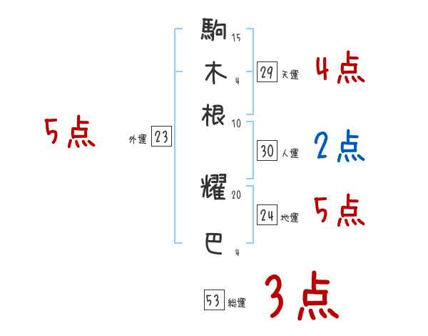外運![]() | 駒木根耀巴さんの外運は23画の5つ星!想像力に優れ活力がある。一代で成功し名誉を手に入れる。 生活面を象徴する運勢です。外部から受ける影響力を表し、結婚運、家庭運や職場、環境への順応性を表します。 |