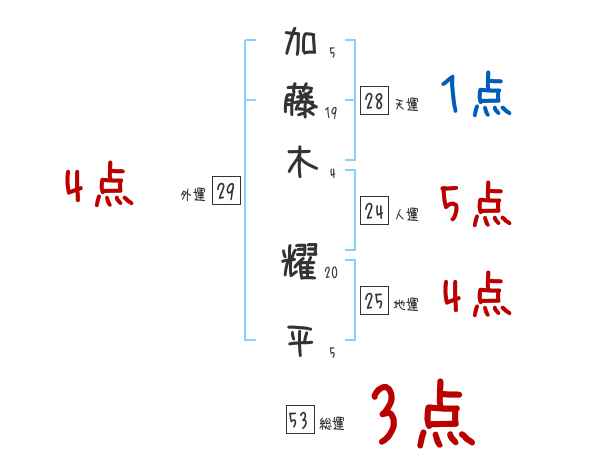 総運![]() | 加藤木耀平さんの総運は53画の3つ星!やや見栄っ張りで虚栄心がある。散財に注意。 あなたの人生を表す1番重要な運勢です。生涯を通じて影響する総合運となり、主に50歳以降の晩年期に影響を及ぼします。 |