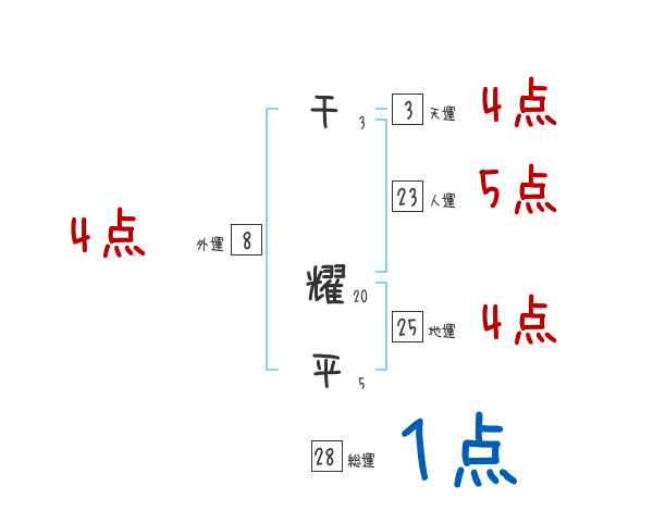 総運![]() | 千耀平さんの総運は28画の1つ星!家庭環境に注意。スポーツで活躍できる能力があるかも。 あなたの人生を表す1番重要な運勢です。生涯を通じて影響する総合運となり、主に50歳以降の晩年期に影響を及ぼします。 |