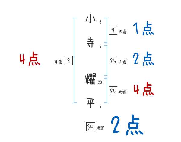 人運![]() | 小寺耀平さんの人運は26画の2つ星!波瀾万丈かも。信頼できる人を大事にしましょう。 性格や才能などを表す2番目に重要な運勢です。人間関係や協調性、社会的な成功に影響します。主に20歳から50歳ぐらいまでの中年期の運勢を表します。 |