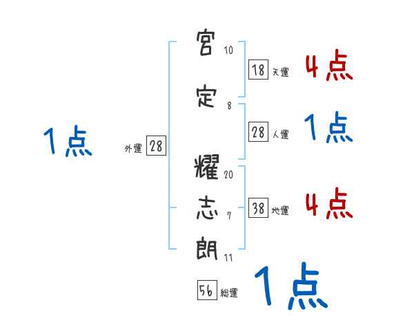人運![]() | 宮定耀志朗さんの人運は28画の1つ星!家庭環境に注意。スポーツで活躍できる能力があるかも。 性格や才能などを表す2番目に重要な運勢です。人間関係や協調性、社会的な成功に影響します。主に20歳から50歳ぐらいまでの中年期の運勢を表します。 |