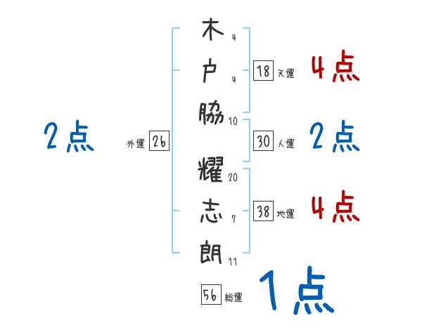 天運![]() | 木戸脇耀志朗さんの天運は18画の4つ星!情熱的で剛気。忍耐力があり信頼される。 家系が持つ宿命的な運勢を表します。祖先から受け継いだ苗字ですので自分の力が及びません。家柄を象徴します。 |