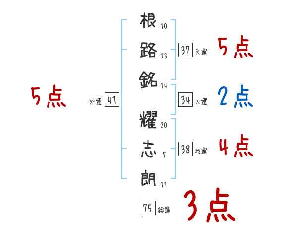総運![]() | 根路銘耀志朗さんの総運は75画の3つ星!慎重な性格で保守的。 あなたの人生を表す1番重要な運勢です。生涯を通じて影響する総合運となり、主に50歳以降の晩年期に影響を及ぼします。 |