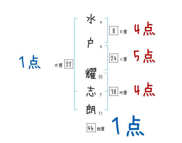外運![]() | 水戸耀志朗さんの外運は22画の1つ星!努力することが苦手ないっぽう手先が器用。芸術性にも優れる。 生活面を象徴する運勢です。外部から受ける影響力を表し、結婚運、家庭運や職場、環境への順応性を表します。 |