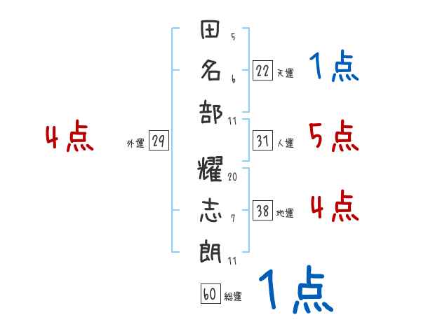 天運![]() | 田名部耀志朗さんの天運は22画の1つ星!努力することが苦手ないっぽう手先が器用。芸術性にも優れる。 家系が持つ宿命的な運勢を表します。祖先から受け継いだ苗字ですので自分の力が及びません。家柄を象徴します。 |