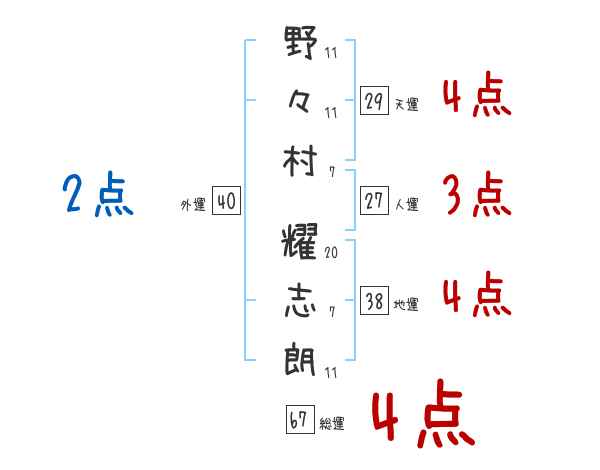 天運![]() | 野々村耀志朗さんの天運は29画の4つ星!完全主義で才能がある。厳格な心の持ち主。 家系が持つ宿命的な運勢を表します。祖先から受け継いだ苗字ですので自分の力が及びません。家柄を象徴します。 |