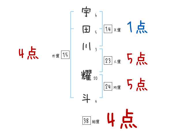 総運![]() | 宇田川耀斗さんの総運は38画の4つ星!温厚な性格で技術的な才能を発揮する。職人的な仕事に向いている。 あなたの人生を表す1番重要な運勢です。生涯を通じて影響する総合運となり、主に50歳以降の晩年期に影響を及ぼします。 |