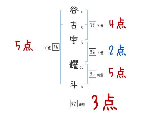 総運![]() | 谷古宇耀斗さんの総運は42画の3つ星!病気に注意。多芸であるが消極的でおとなしい。 あなたの人生を表す1番重要な運勢です。生涯を通じて影響する総合運となり、主に50歳以降の晩年期に影響を及ぼします。 |