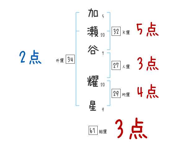 天運![]() | 加瀬谷耀星さんの天運は32画の5つ星!柔軟性があり成功する。チャンスが多く金運が良い。 家系が持つ宿命的な運勢を表します。祖先から受け継いだ苗字ですので自分の力が及びません。家柄を象徴します。 |