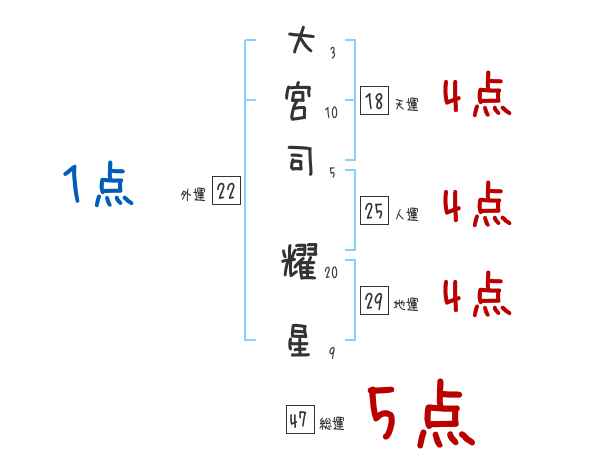 外運![]() | 大宮司耀星さんの外運は22画の1つ星!努力することが苦手ないっぽう手先が器用。芸術性にも優れる。 生活面を象徴する運勢です。外部から受ける影響力を表し、結婚運、家庭運や職場、環境への順応性を表します。 |
