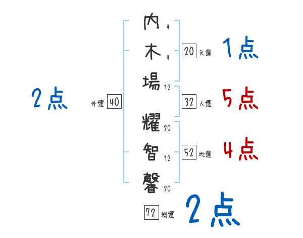 総運![]() | 内木場耀智馨さんの総運は72画の2つ星!災難が多く不安定な生活にならないように注意。明暗のある人生かも。 あなたの人生を表す1番重要な運勢です。生涯を通じて影響する総合運となり、主に50歳以降の晩年期に影響を及ぼします。 |