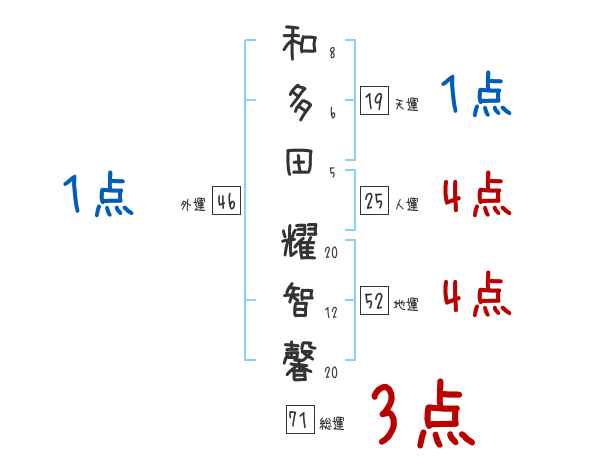 総運![]() | 和多田耀智馨さんの総運は71画の3つ星!力が弱く小心者だが、いずれ安泰を手に入れる。 あなたの人生を表す1番重要な運勢です。生涯を通じて影響する総合運となり、主に50歳以降の晩年期に影響を及ぼします。 |