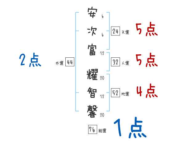 天運![]() | 安次富耀智馨さんの天運は24画の5つ星!家庭運が良く順調な人生。金運にも恵まれる。 家系が持つ宿命的な運勢を表します。祖先から受け継いだ苗字ですので自分の力が及びません。家柄を象徴します。 |