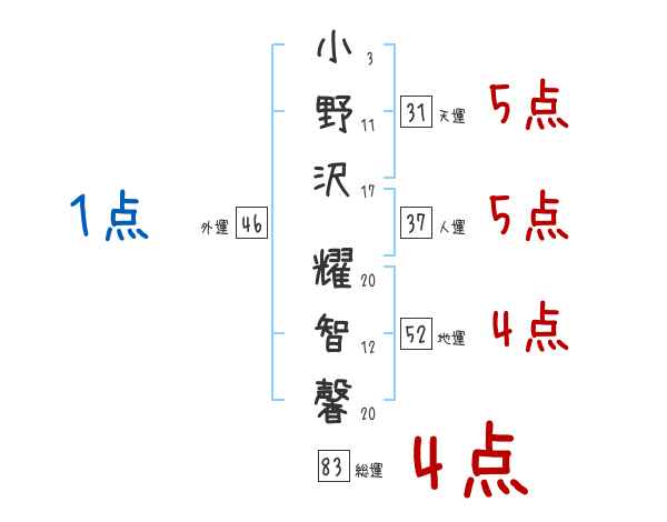総運![]() | 小野沢耀智馨さんの総運は83画の4つ星!活動的で才能に恵まれ、多くの信頼を得る。希望に満ち成長する。 あなたの人生を表す1番重要な運勢です。生涯を通じて影響する総合運となり、主に50歳以降の晩年期に影響を及ぼします。 |