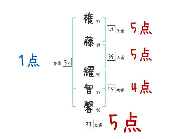 外運![]() | 権藤耀智馨さんの外運は54画の1つ星!トラブルが多いかも。周りをよく見て協調して過ごしましょう。 生活面を象徴する運勢です。外部から受ける影響力を表し、結婚運、家庭運や職場、環境への順応性を表します。 |