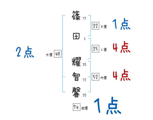 天運![]() | 篠田耀智馨さんの天運は22画の1つ星!努力することが苦手ないっぽう手先が器用。芸術性にも優れる。 家系が持つ宿命的な運勢を表します。祖先から受け継いだ苗字ですので自分の力が及びません。家柄を象徴します。 |