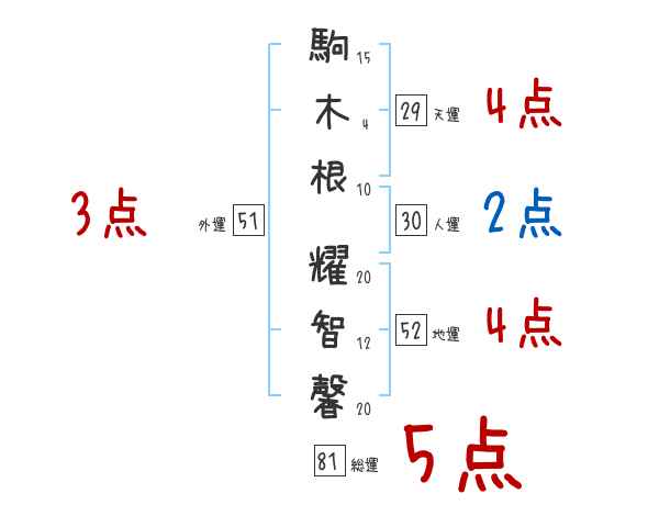 外運![]() | 駒木根耀智馨さんの外運は51画の3つ星!変化が激しく、危険に注意。堅実な性格。 生活面を象徴する運勢です。外部から受ける影響力を表し、結婚運、家庭運や職場、環境への順応性を表します。 |
