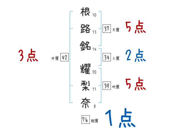 総運![]() | 根路銘耀梨奈さんの総運は76画の1つ星!離散に注意。劣等感を感じ孤立しやすい傾向があるかも。 あなたの人生を表す1番重要な運勢です。生涯を通じて影響する総合運となり、主に50歳以降の晩年期に影響を及ぼします。 |