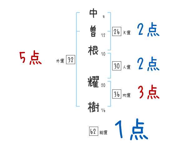 外運![]() | 中曽根耀樹さんの外運は32画の5つ星!柔軟性があり成功する。チャンスが多く金運が良い。 生活面を象徴する運勢です。外部から受ける影響力を表し、結婚運、家庭運や職場、環境への順応性を表します。 |