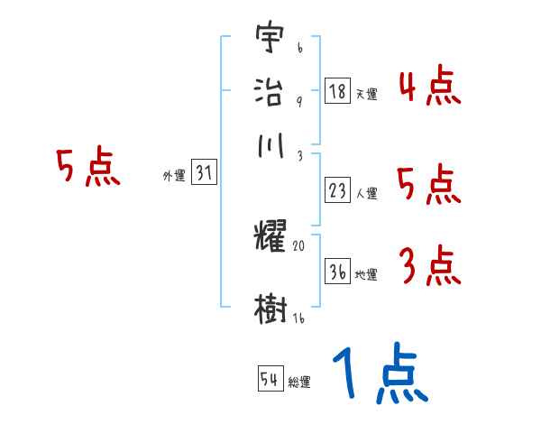 総運![]() | 宇治川耀樹さんの総運は54画の1つ星!トラブルが多いかも。周りをよく見て協調して過ごしましょう。 あなたの人生を表す1番重要な運勢です。生涯を通じて影響する総合運となり、主に50歳以降の晩年期に影響を及ぼします。 |