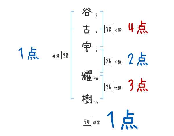 天運![]() | 谷古宇耀樹さんの天運は18画の4つ星!情熱的で剛気。忍耐力があり信頼される。 家系が持つ宿命的な運勢を表します。祖先から受け継いだ苗字ですので自分の力が及びません。家柄を象徴します。 |