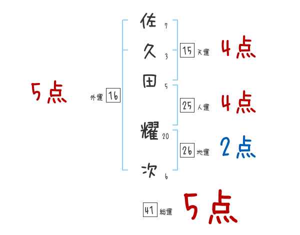 外運![]() | 佐久田耀次さんの外運は16画の5つ星!人望が厚く大きく発展する。逆転成功が見える。 生活面を象徴する運勢です。外部から受ける影響力を表し、結婚運、家庭運や職場、環境への順応性を表します。 |
