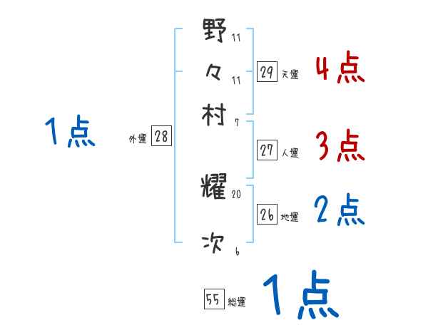 天運![]() | 野々村耀次さんの天運は29画の4つ星!完全主義で才能がある。厳格な心の持ち主。 家系が持つ宿命的な運勢を表します。祖先から受け継いだ苗字ですので自分の力が及びません。家柄を象徴します。 |