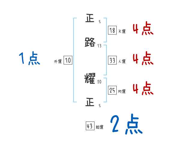 天運![]() | 正路耀正さんの天運は18画の4つ星!情熱的で剛気。忍耐力があり信頼される。 家系が持つ宿命的な運勢を表します。祖先から受け継いだ苗字ですので自分の力が及びません。家柄を象徴します。 |