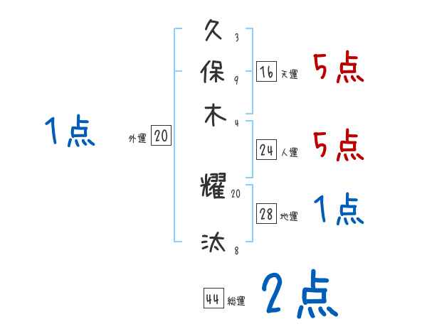 総運![]() | 久保木耀汰さんの総運は44画の2つ星!誠実で慎重な性格。物事を考えすぎないように注意しましょう。 あなたの人生を表す1番重要な運勢です。生涯を通じて影響する総合運となり、主に50歳以降の晩年期に影響を及ぼします。 |