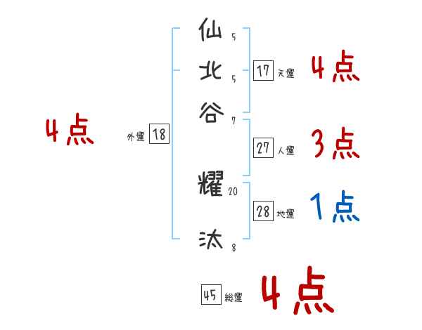 外運![]() | 仙北谷耀汰さんの外運は18画の4つ星!情熱的で剛気。忍耐力があり信頼される。 生活面を象徴する運勢です。外部から受ける影響力を表し、結婚運、家庭運や職場、環境への順応性を表します。 |