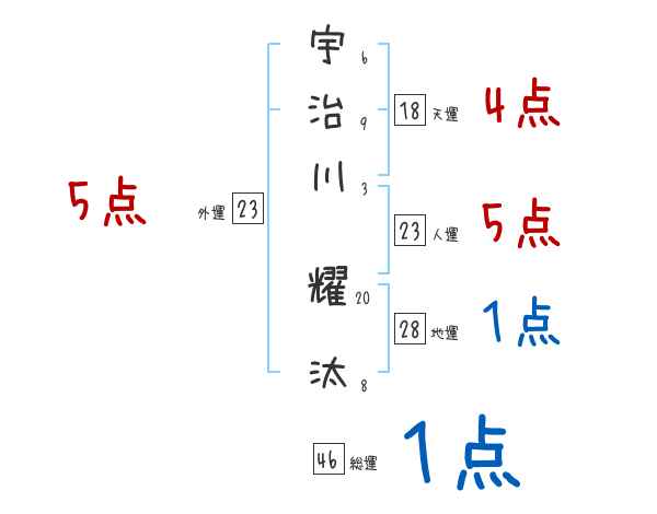外運![]() | 宇治川耀汰さんの外運は23画の5つ星!想像力に優れ活力がある。一代で成功し名誉を手に入れる。 生活面を象徴する運勢です。外部から受ける影響力を表し、結婚運、家庭運や職場、環境への順応性を表します。 |