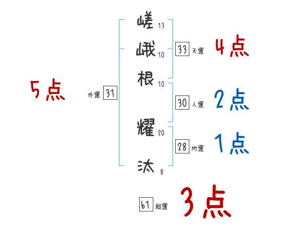 天運![]() | 嵯峨根耀汰さんの天運は33画の4つ星!権力志向でプライドが高い。勇気があり運を切り開き成功する。 家系が持つ宿命的な運勢を表します。祖先から受け継いだ苗字ですので自分の力が及びません。家柄を象徴します。 |