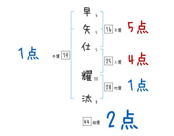 天運![]() | 早矢仕耀汰さんの天運は16画の5つ星!人望が厚く大きく発展する。逆転成功が見える。 家系が持つ宿命的な運勢を表します。祖先から受け継いだ苗字ですので自分の力が及びません。家柄を象徴します。 |