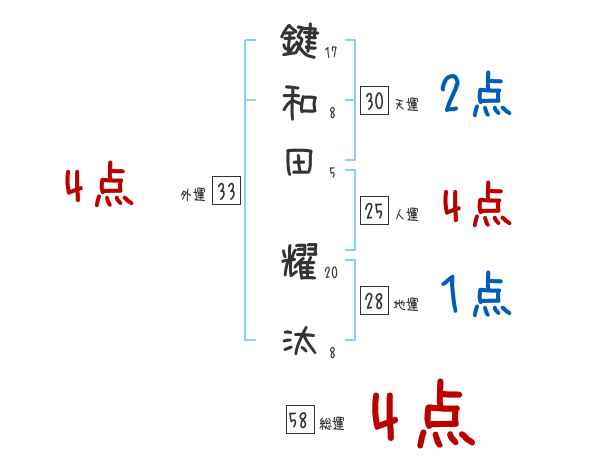 外運![]() | 鍵和田耀汰さんの外運は33画の4つ星!権力志向でプライドが高い。勇気があり運を切り開き成功する。 生活面を象徴する運勢です。外部から受ける影響力を表し、結婚運、家庭運や職場、環境への順応性を表します。 |