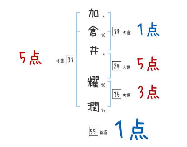 人運![]() | 加倉井耀潤さんの人運は24画の5つ星!家庭運が良く順調な人生。金運にも恵まれる。 性格や才能などを表す2番目に重要な運勢です。人間関係や協調性、社会的な成功に影響します。主に20歳から50歳ぐらいまでの中年期の運勢を表します。 |