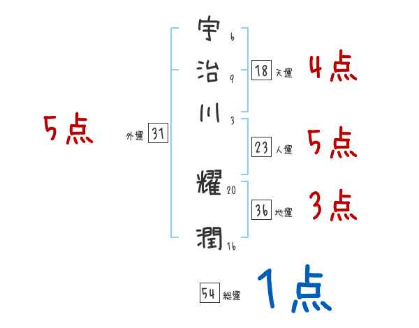 総運![]() | 宇治川耀潤さんの総運は54画の1つ星!トラブルが多いかも。周りをよく見て協調して過ごしましょう。 あなたの人生を表す1番重要な運勢です。生涯を通じて影響する総合運となり、主に50歳以降の晩年期に影響を及ぼします。 |