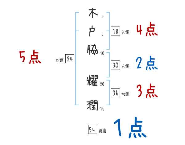 天運![]() | 木戸脇耀潤さんの天運は18画の4つ星!情熱的で剛気。忍耐力があり信頼される。 家系が持つ宿命的な運勢を表します。祖先から受け継いだ苗字ですので自分の力が及びません。家柄を象徴します。 |